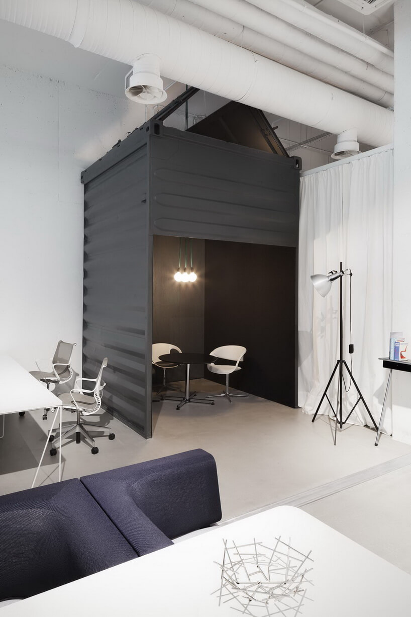 Bulgaria Workplace is an international office supplies company that is seeking innovative and non-traditional ways to showcase its products. One of the requirements is to submit designs based on trends in reuse and recycling. Based on this, the design team defined a space that emphasizes industrial features - polished concrete floors, visible installation and renovation containers - as the focal point of the public space. The entire space only uses concrete floors, white walls, ceilings, and fixtures as materials. The combination of this design and container creates a simple industrial style appearance, emphasizing complex patterns and showcasing precise details of furniture.